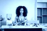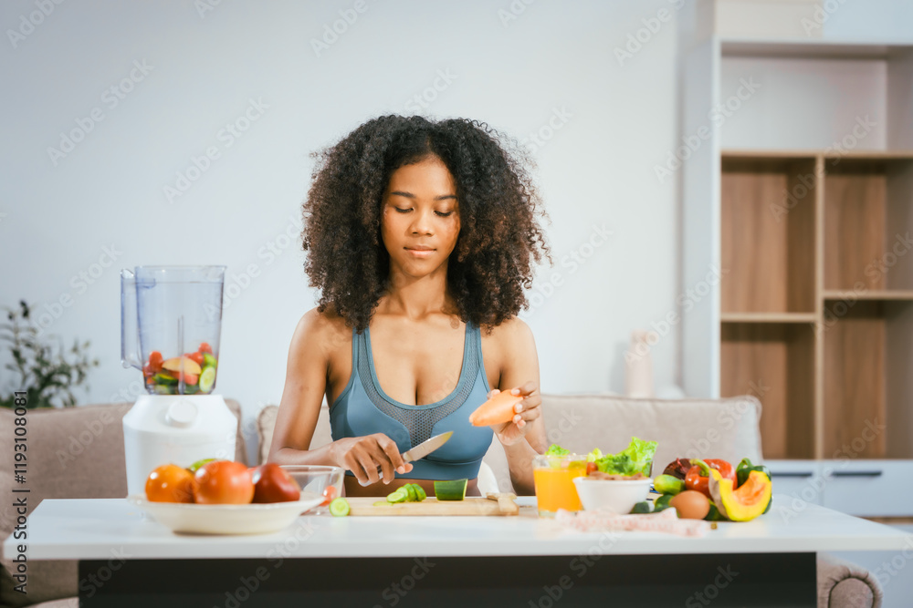 An African American woman in sportswear sits on a sofa near the dining table, preparing a healthy salad with vegetables fruits, drinking juice after exercise for weight control and low-fat nutrition
