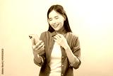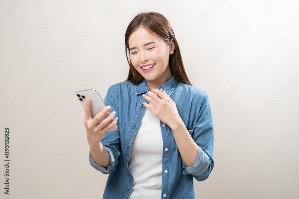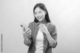 Happy asian young woman using mobile smart phone, read good news online, laugh excited getting offer, great positive surprise, celebrate success on smartphone. Smile girl isolated on white background.