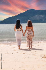 Two attractive women friends enjoying and relaxing on the beach, Summer, vacation, holidays, Lifestyles concept.