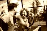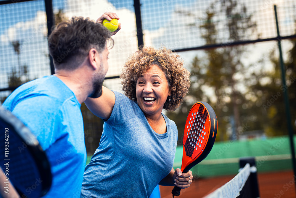 Mixed adult couple celebrate winning the point in padel on outdoor court.