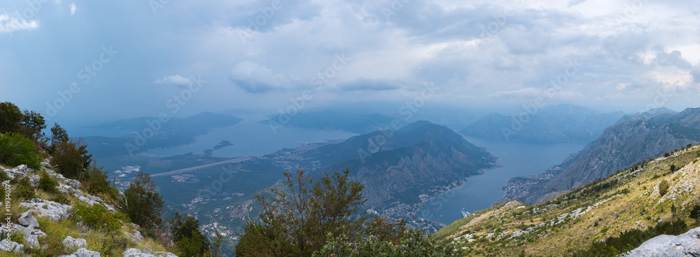 Рanorama Kotor bay from mount Lovchen. Cloudy day.