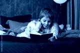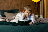 Little toddler child, boy, lying in bed with pet dog, little maltese dog, reading a book, soft light