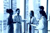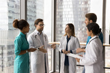 Serious staff members, clinic workers dressed in uniforms stand together in office, listen speech of chief, leading team meeting on medical issue. Professional exchange of information among colleagues