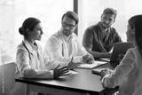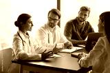 Diverse doctors engaged in meeting led by Indian GP, discuss complex patient cases, review medical history, diagnostic results, and treatment plans, take part in collaborative approach to patient care