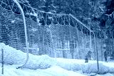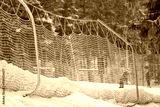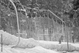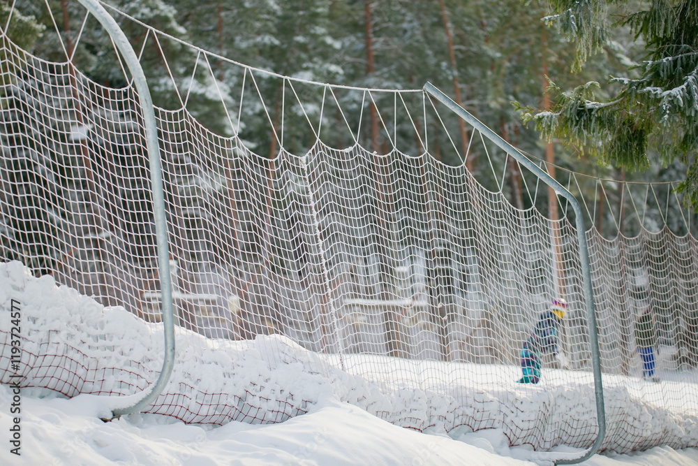 Ski slope forest safety net covered in snow for skier and snowboarder safety and track limits