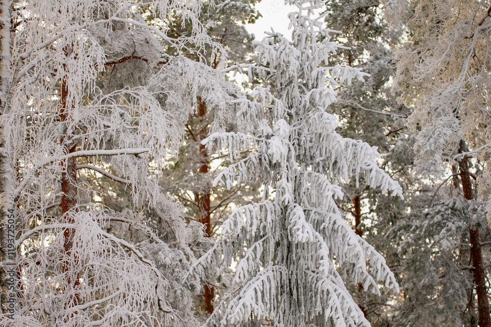 Beautiful dream like snow covered pine branches in sunshine after wild snow storm that got everything snow covered