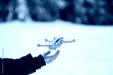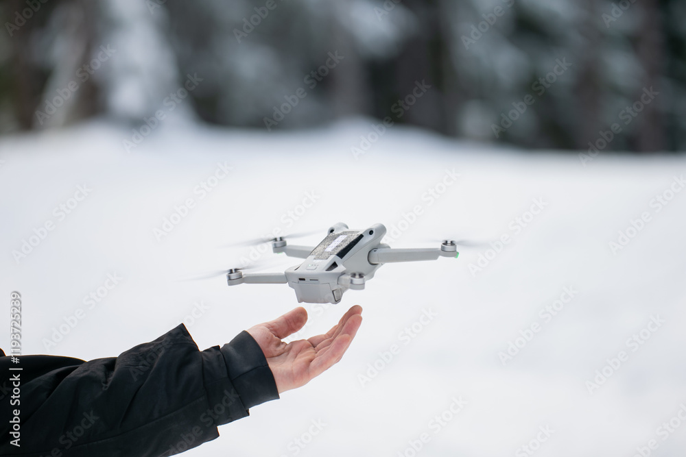 Small commercial drone landing on a hand palm after flying. Small drone for filming marketing and extreme videos for social media. Perfect video tool for professionals