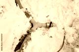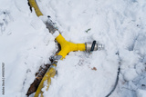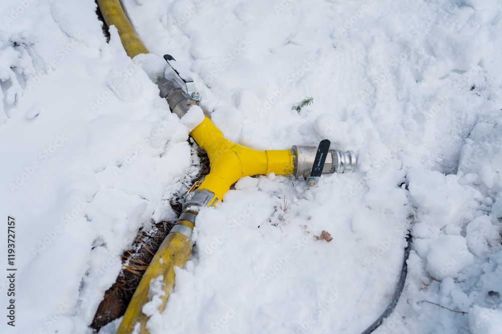 Yellow industrial water and pressure pipes on snow surface for water transportation and pressure control