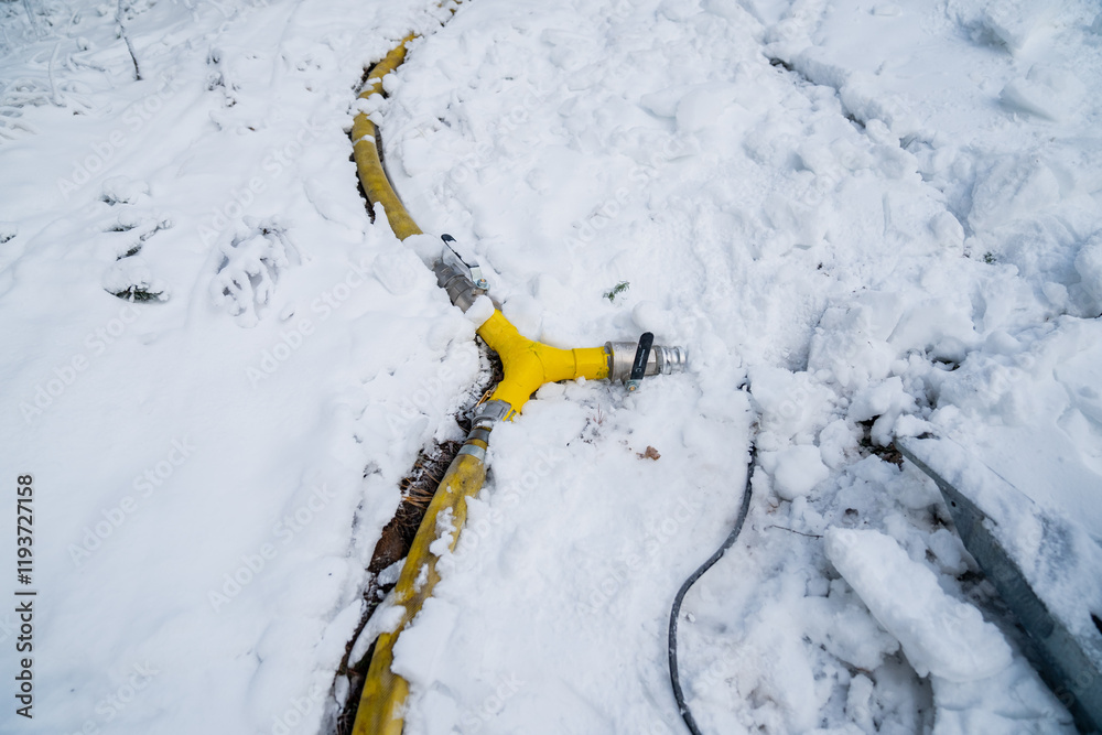 Yellow industrial water and pressure pipes on snow surface for water transportation and pressure control