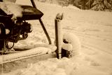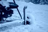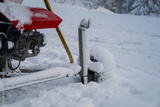 Totally snow-covered tire of trailer for engine on mountain ski slope piste