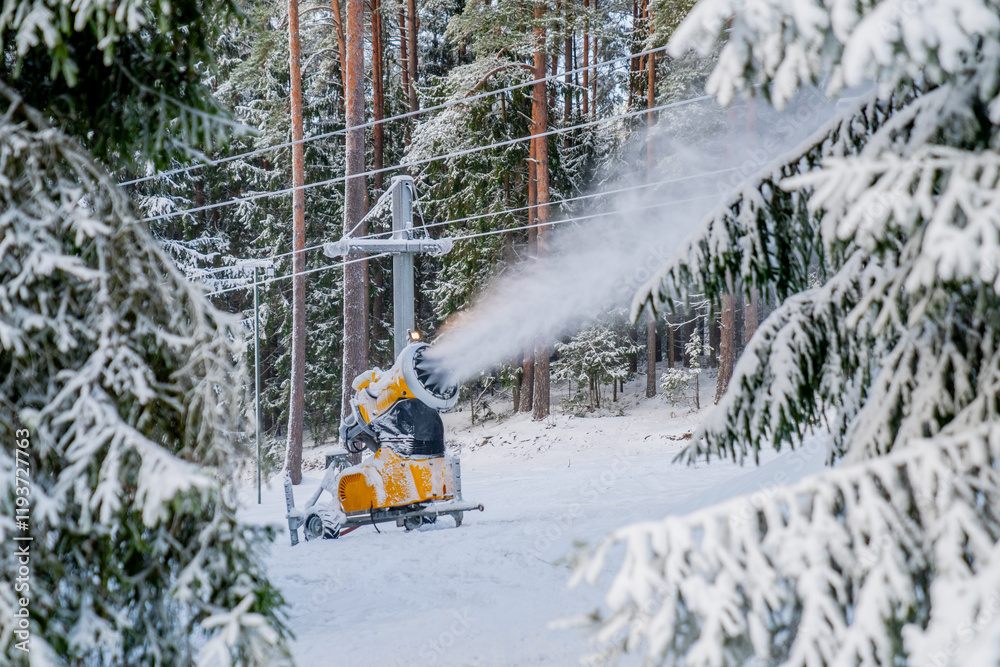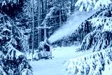 Snow winter resort ski slope being covered in artificial snow by snowmaking cannon