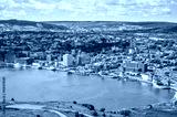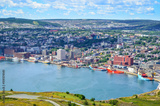 Panoramic views with bight blue summer day sky with puffy clouds over the harbour and city of St. John's Newfoundland, Canada.