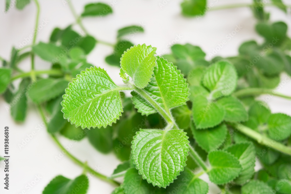 Branches and leafs of the mint on white background