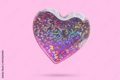 Pink heart shape hologram sticker flying on pink background