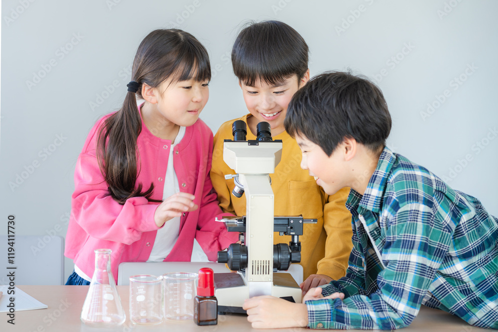 顕微鏡で観察する小学生 撮影協力:学校法人電波学園 東京電子専門学校