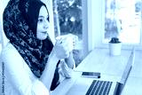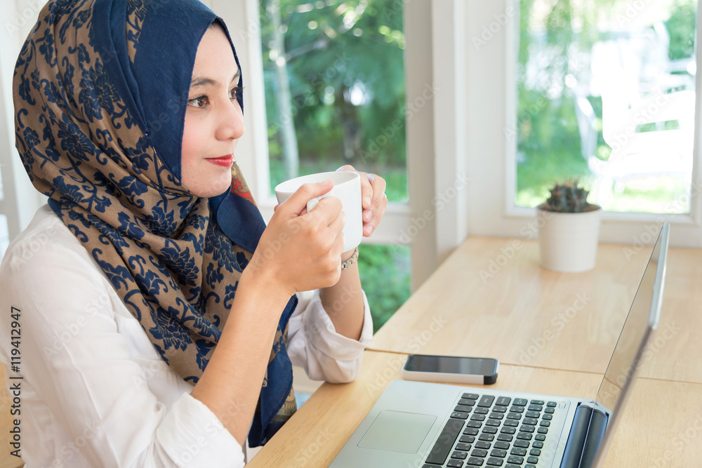 Muslim woman with computer on table , holding a coffee cup.