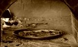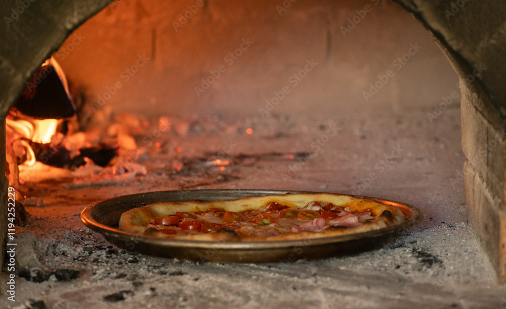 A pizza baking in wood fired oven. It can also be used to dry and smoke food. Cooking on a wood fire is authentic and brings an unrivalled flavour to your dishes.