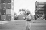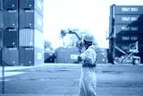 back view worker or engineer using walkie talkie and showing gesture to crane car in containers warehouse storage