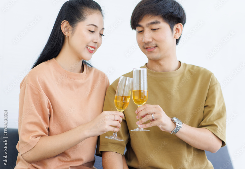 Asian young happy attractive couple love sweethearts smile drinking clinking holding champagne glasses sitting on cozy sofa in living room at home to celebrating anniversary enjoy good time together.