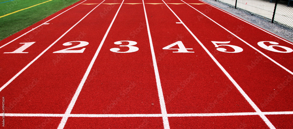 The start line of the 100 meter dash in Track & Field