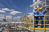 group of workers professional equipment in a petroleum refinery - modern buildings and industrial facilities for the production of fuel and gas