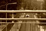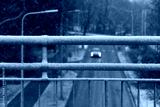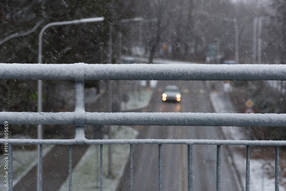SNOWFALL IN THE CITY - Snow on the bridge railing and vehicle on wet street surface