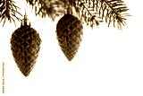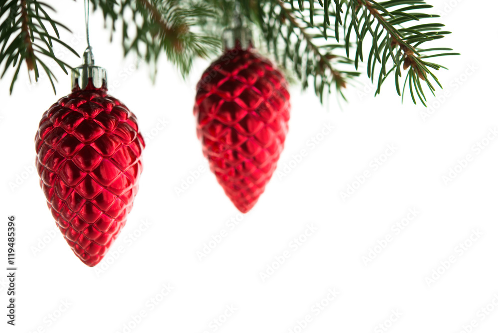 Red christmas ornaments (cones) on the xmas tree on white background isolated. Winter holiday theme.