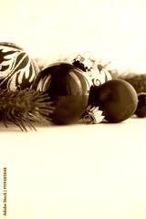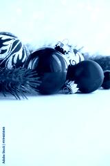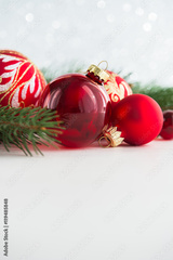Red xmas ornaments on glitter holiday background. Merry christmas card. Winter theme. Happy New Year. Space for text.