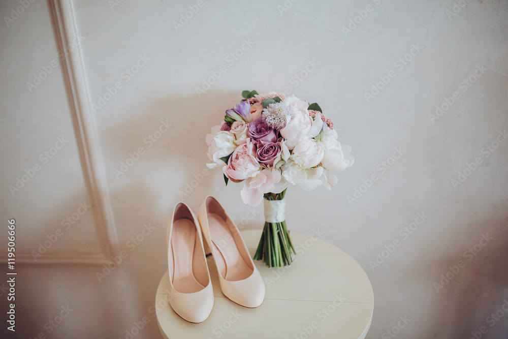 Shoes of the bride standing next to a wedding bouquet of flowers and greenery