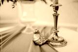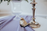 bird figure stands on a table next to a glass vase and candlestick in the area of wedding photo zone
