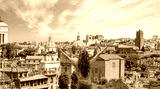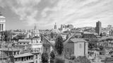 Beautiful young woman stands with her back to the arms raised in joy - Ancient roman forum columns and ruins - Rome, Italy