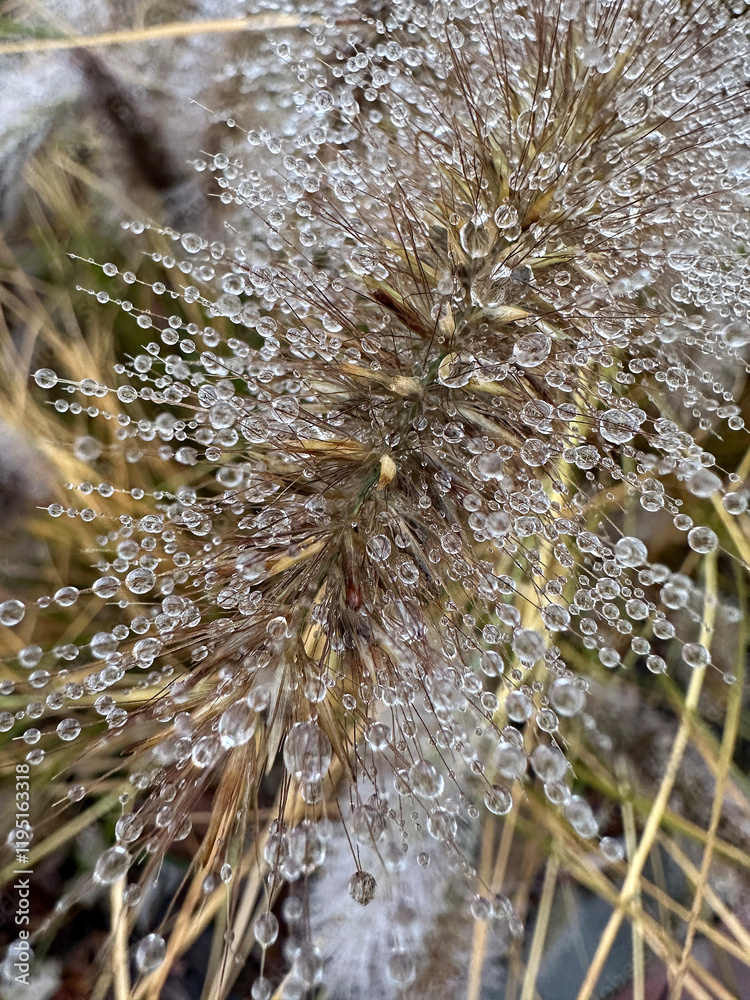 Dew drops clinging to ornamental grass seed head: close-up view of nature's beauty