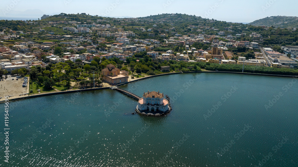 Aerial view of the Casina Vanvitelliana located on a small island in Lake Fusaro in Bacoli, in the metropolitan city of Naples, in Campania, Italy. It is an old hunting lodge in baroque style.