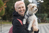 Joyful affectionate mature woman embracing pet dog Jack Russell Terrier in nature