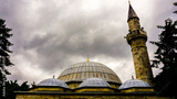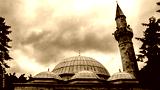 Majestic minaret towers under a dramatic cloudy sky, framed by the domes of an ancient mosque, highlighting a historical and spiritual setting.