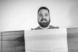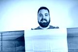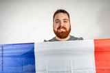 Young man with a red beard holding the French flag above his head in a studio with a neutral background. The vibrant tricolor stands out, symbolizing pride and identity.