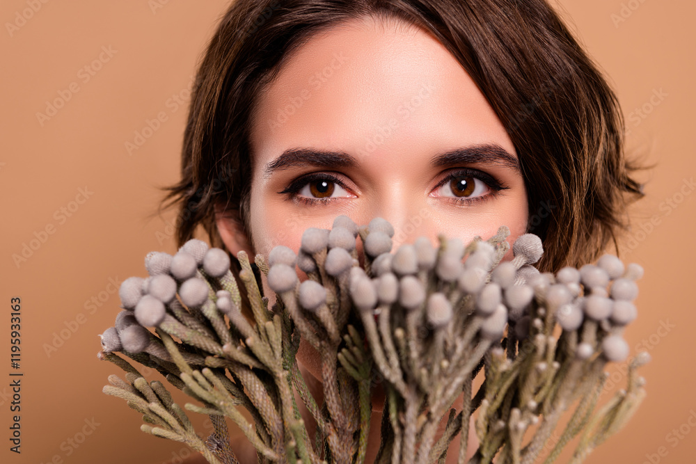 Photo of attractive girl cover face with catkin branch bouquet isolated pastel color background