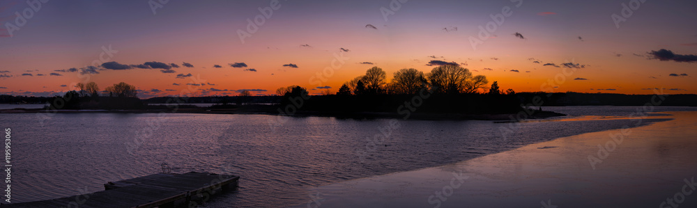 Seascape at Sunset over the Buzzard Bay in Dartmouth, Massachusetts, USA: A vibrant panoramic winter evening landscape of New England of America