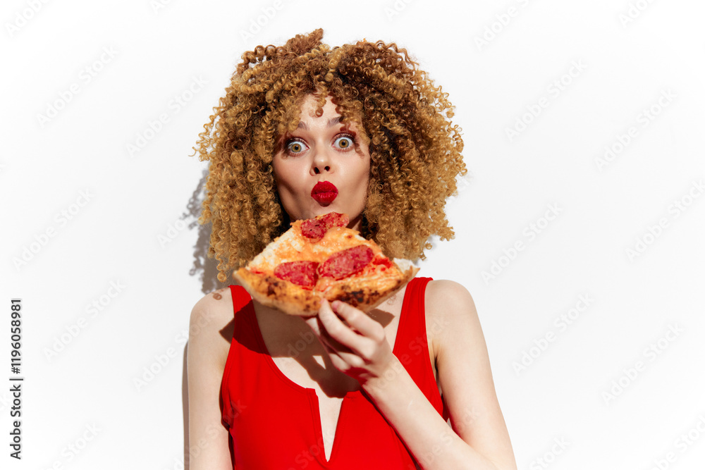 Young woman with curly hair in a red dress excitedly holding a slice of pizza, showcasing emotions of delight and surprise against a bright white background