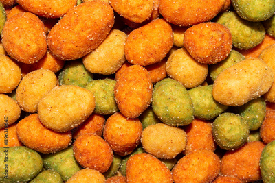 Roasted salted peanuts in a crispy crust mix.Peanuts in a shell with the taste of wasabi, bacon and cheese.Peanuts are crunchy.Peanuts for beer.