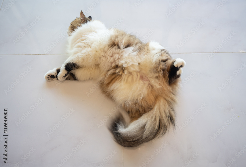 Cute crossbreed Persian cat showing belly while sleeping on the floor. If a cat is sleeping with their belly exposed, it means they feel very safe and confident.