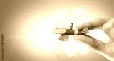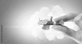 Student girl in old airplane . Mixed media