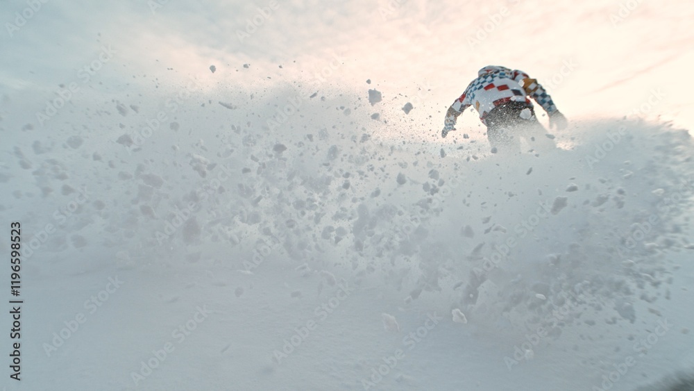 Free Ride Snowboarder Running Down the Hill. Freeze Motion. Powder Snow Exploding.