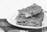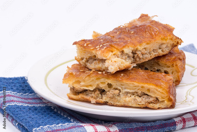 Homemade burek with minced meat over white background