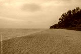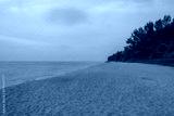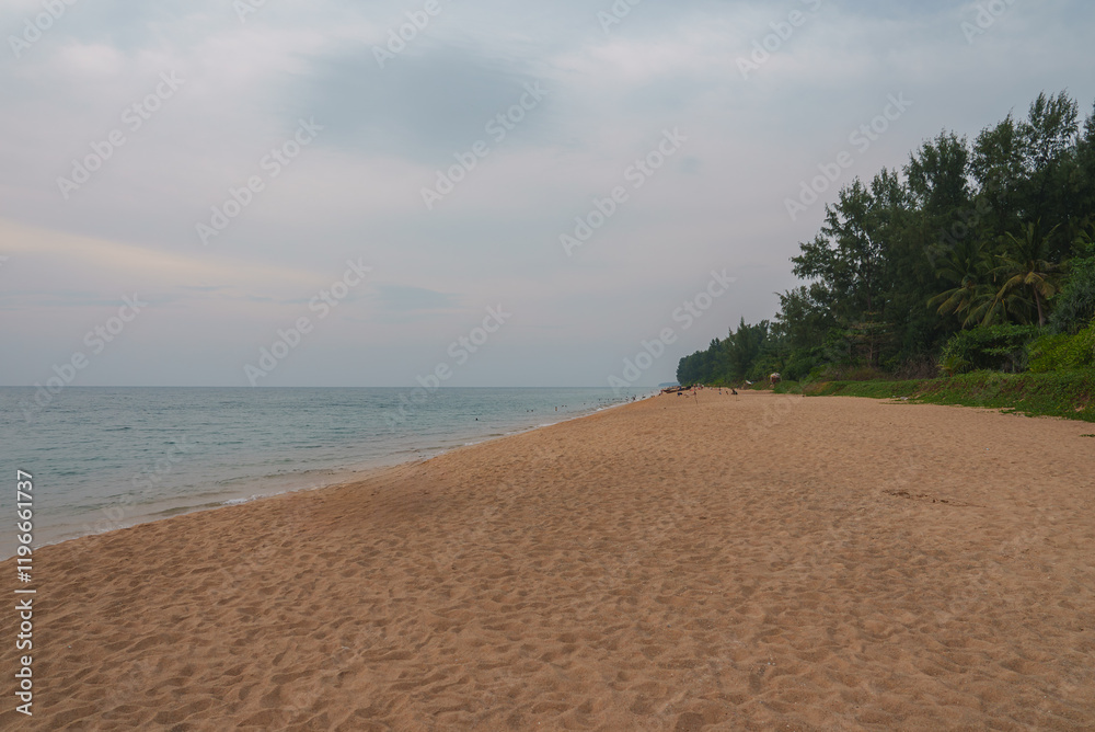 A tranquil sandy beach in Phuket, Thailand, with calm waves under an overcast sky. Lush greenery lines the shore, creating a peaceful scene.