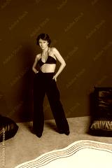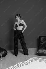 stylish model stands confidently with hands on her hips, showcasing a black crop top and high-waisted pants