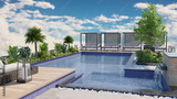 Rooftop area features a contemporary swimming pool bordered by lush plants and trees. Comfortable lounge chairs provide relaxation under a bright blue sky filled with clouds. 3d render