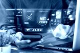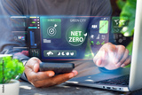 Net zero and carbon neutral concept. Green Energy Renewable Sustainable. Net zero, society and governance. Businessman uses iPad to analyze ESG in business investment strategy concept.