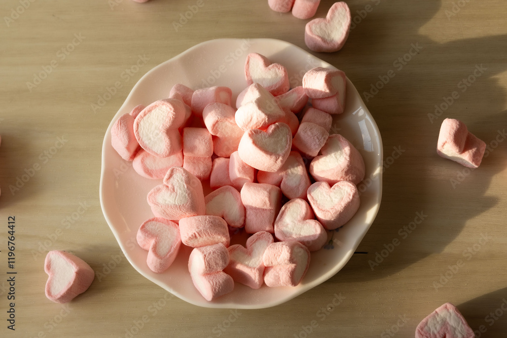 Valentine background, a dish filled with light pink and white marshmallow candies in the shape of a heart with natural light on a light wooden base.