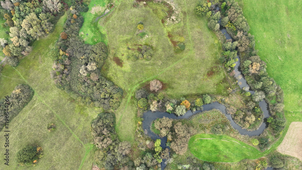 Inland river delta river meanders drone aerial shot in floodplain forest lowlands wetland swamp, quadcopter view flying fly flight show, protected landscape area Ltovelske Pomoravi Europe